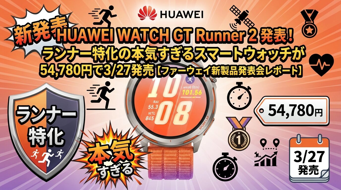 どうも、スマートウォッチは日常で使い続けているタケイ(@pcefancom)です。 2026年3月17日、ファーウェイ・ジャパンの2026年Q1新製品発表会に参加してきました! 今回の目玉は、ランナー特化型スマートウォッチ「HUAWEI WATCH GT Runner 2」です。 結論から言うと、これはかなり本気のモデルです。5年の開発期間をかけ、世界で初めてフルマラソン2時間切りを達成したキプチョゲ選手をグローバルアンバサダーに迎え、トップアスリートの実践データをもとに開発されたという力の入りよう。ケー ...