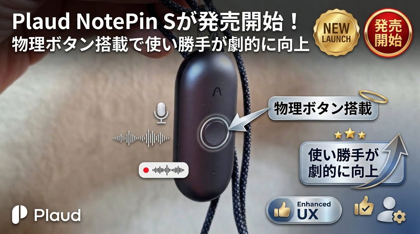 どうも、AIボイスレコーダーで議事録作成やブログの下書きを効率化しているタケイ(@pcefancom)です。 本日2026年3月23日、PLAUDからウェアラブルAIボイスレコーダーの新モデル「Plaud NotePin S」が発売されました。 価格は28,600円(税込)。アプリの更新によりすぐに利用可能になっています。最大の進化は「物理ボタン」の搭載。たったそれだけ? と思う方もいるかもしれませんが、これが使い勝手を根本から変えるんですよね。実際に使ってみた感想とあわせて、製品の概要を紹介します。 P ...