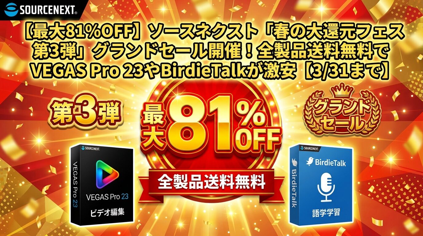 【最大81%OFF】ソースネクスト「春の大還元フェス 第3弾」グランドセール開催!全製品送料無料でVEGAS Pro 23やBirdieTalkが激安【3/31まで】
