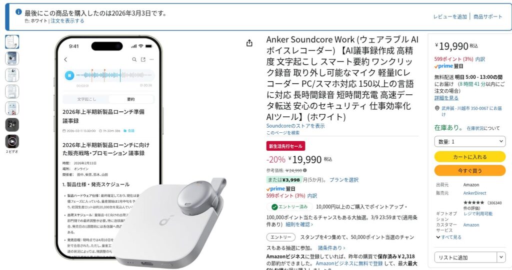 買ったのはAnker初のAIボイスレコーダー「Soundcore Work」です。Amazon新生活セールで20%OFFの19,990円(税込)で購入し、本日到着予定です。
