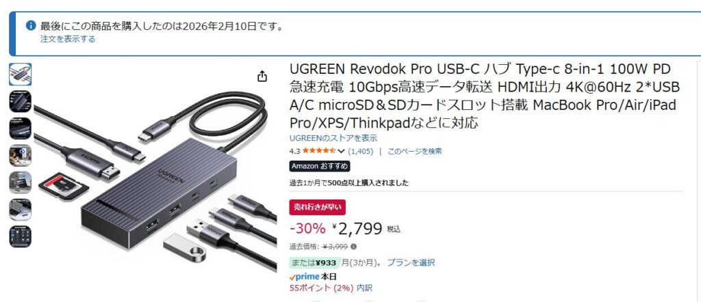 UGREENは頻繁にタイムセールをやっているので、3,000円以下で購入できるチャンスは多いです。USB-Cハブを探している方はぜひチェックしてみてください。