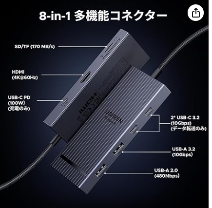 今回は「UGREEN Revodok Pro USB-Cハブ Type-C 8in1 100W PD対応」を買いました。