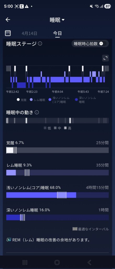 今回の記録では睡眠スコアは67点(良好)、睡眠効率は87%(正常範囲)でした。浅いノンレム(コア)睡眠が68.0%、深いノンレム睡眠が16.0%、レム睡眠が9.3%という内訳です。
