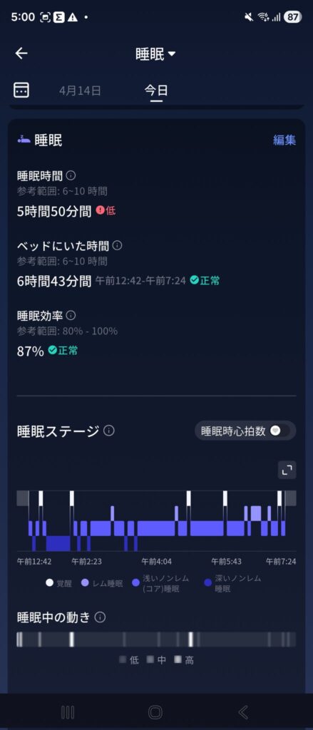 実際に今回のデータを見ると、ベッドにいた時間が6時間43分(午前12:42〜午前7:24)、そのうち実際の睡眠時間は5時間50分と記録されています。この数値、体感とかなり一致している感じ。スマートウォッチ2台と比べても、ベッドインから就寝までのタイムラグの精度がRingconnは飛び抜けています。