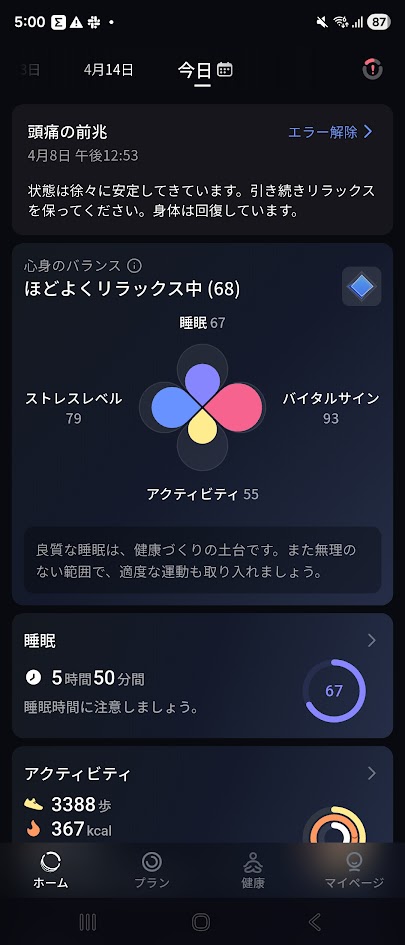 実際に「4月8日 午後12:53」に頭痛の前兆が記録されていて、「状態は徐々に安定してきています。引き続きリラックスを保ってください。身体は回復しています。」というメッセージも表示されていました。こういった体調変化の予兆を事前にキャッチしてくれるのは、スマートウォッチではあまり経験できない体験です。