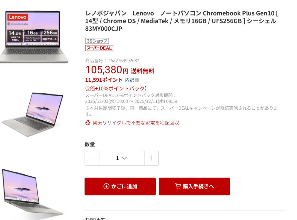 モデル: Lenovo Chromebook Plus Gen 10 (83MY000CJP)