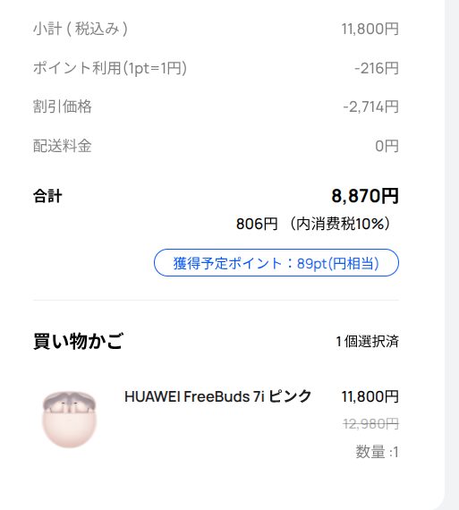 「HUAWEI Freebuds 7i」の定価は12,800円ですが、レジ割で9%オフの11,800円。