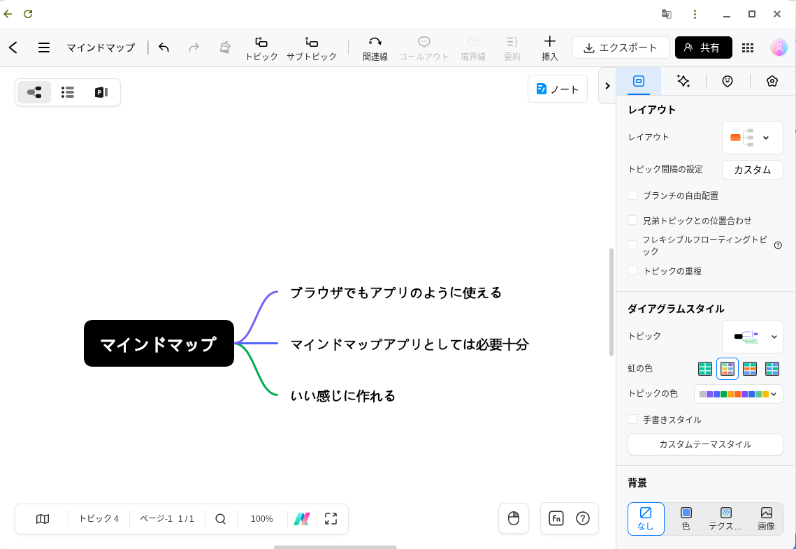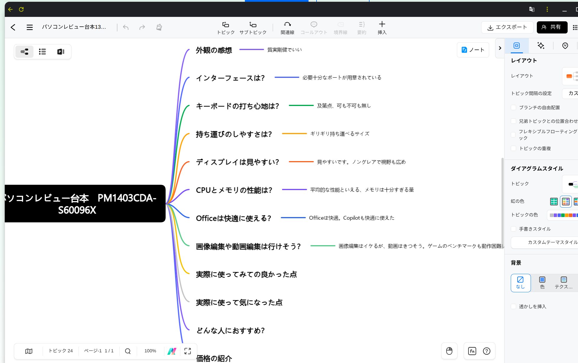 無料版でも100個ほどはトピックが作れたので簡単なマインドマップを作るには十分でした。