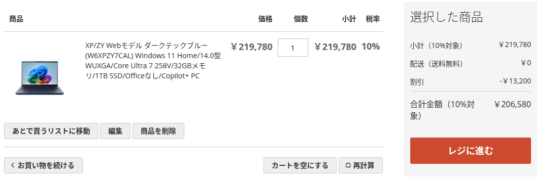 まず「Dynabook Direct」に会員登録するだけで4万5千引きの219,780円までさがります。
