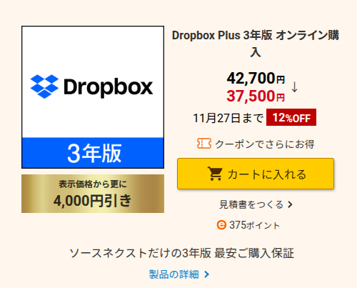 33,500円|Dropbox Plus 3年版が12%OFFから、さらに4,000円引き!