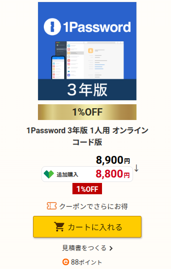 - 対象製品: 1Password 3年版 1人用 オンラインコード版