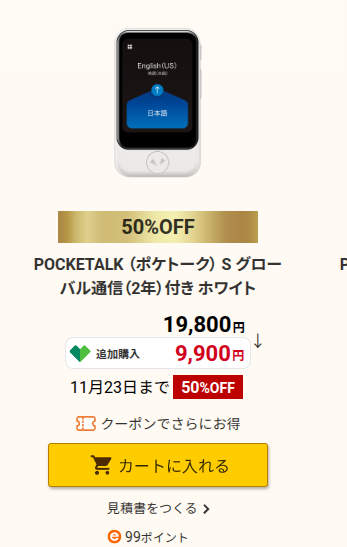 - 対象製品: POCKETALK(ポケトーク) S グローバル通信(2年)付き ホワイト