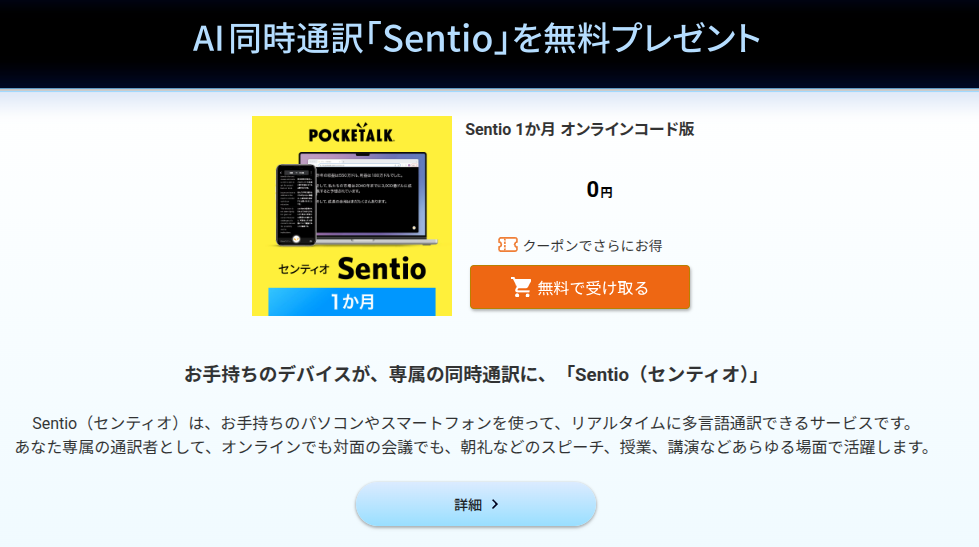 PCやスマートフォンが専用の同時通訳デバイスになるサービス、AI同時通訳「Sentio(センティオ)」のキャンペーンが実施されています。