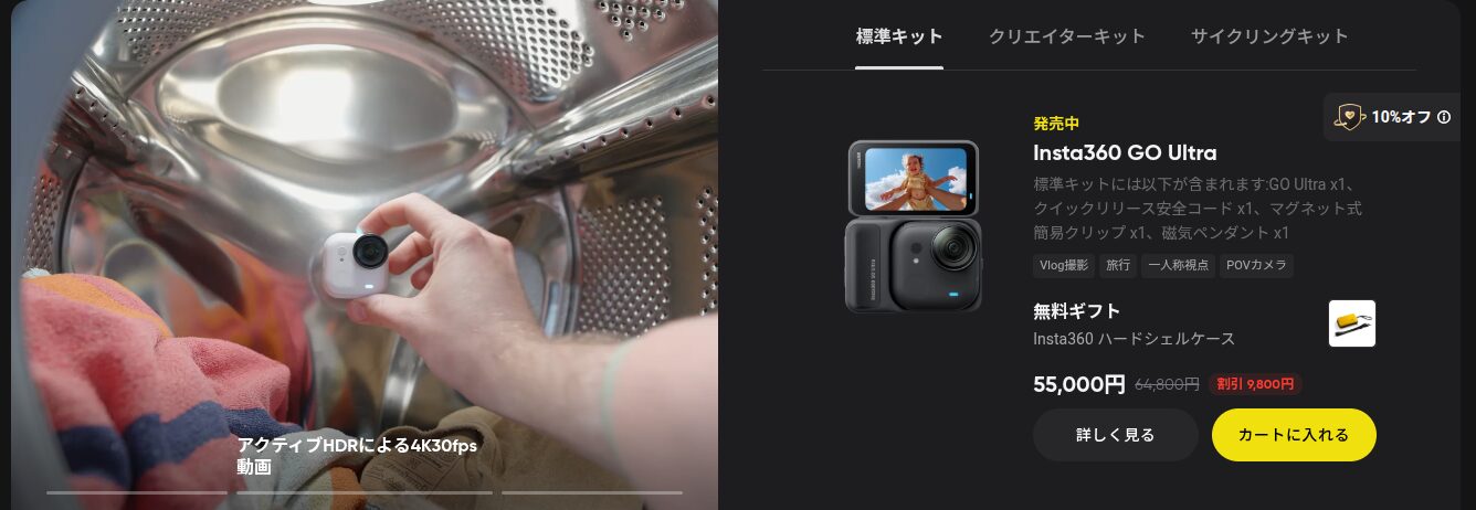 セールでは通常価格64,800円から9,800円割引の55,000円となっており、無料ギフトとして「Insta360 ハードシェルケース」が付属します。