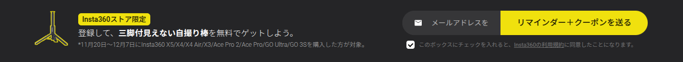 事前にメールアドレスを登録し、11月20日から12月7日の期間中に対象製品(Insta360 X5、X4、X4 Air、X3、Ace Pro 2、Ace Pro、GO Ultra、GO 3S)のいずれかを購入した方は、「三脚付見えない自撮り棒」を無料で受け取ることができます。