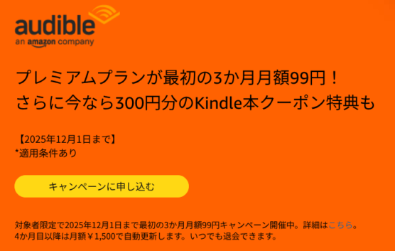 通常月額1,500円のAmazon Audible(オーディブル)が、ブラックフライデーで3ヶ月99円という破格のキャンペーンを実施していたので、即申し込みました!