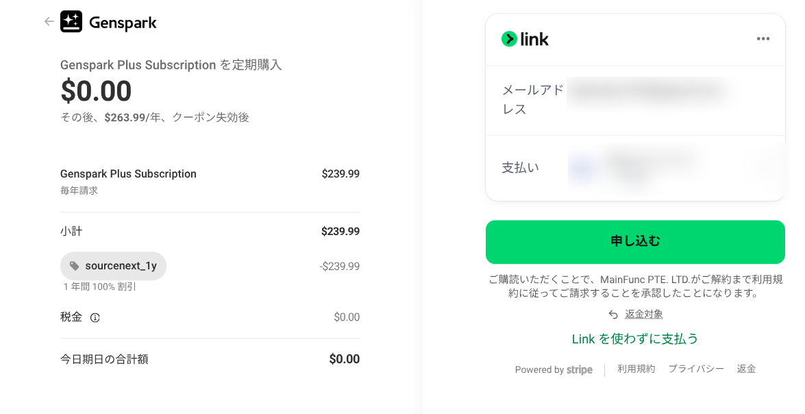そうするとソースネクストのコードが適用された状態でGenSparkの購入ページが開きます。