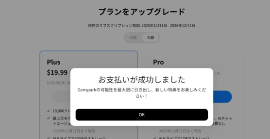 12月2日までですが、GenSpark Plus(1年版)は23,000円で済みました。