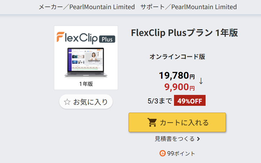 ソースネクストで、AI動画編集サービス「FlexClip Plus」の1年版が49%OFFの9,900円になっています。セール期間は5月3日(日)まで。