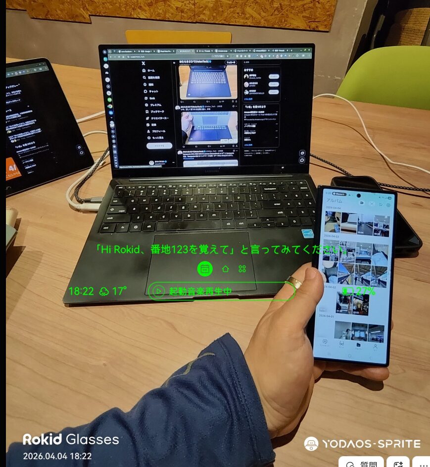 パソコンで作業をしながら、「Hi Rokid、番地123を教えて」と話しかけるだけで、Geminiが答えてくれます。画像にも写っていますが、音声認識が走って、視界に回答が表示される。この流れがめちゃくちゃスムーズなんです。