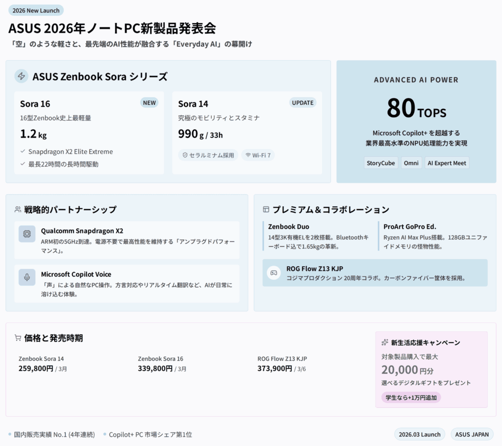 ASUSから、日本市場向けに開発された超軽量AIノートPC「ASUS Zenbook SORA」シリーズの第2世代モデルが発表されました。