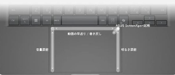 タッチパッドの端をスワイプするだけで、動画の早送り・巻き戻し、音量調整、画面の明るさ調整ができる「スマートタッチパッド」も搭載。右斜め上から左下にスワイプすると「ASUS ScreenXpert」アプリが起動して、パソコンの各種設定も行えます。