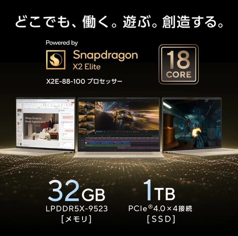 | CPU | Snapdragon X2 Elite X2E-88-100(18コア/最大4.7GHz) |