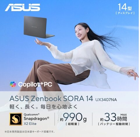 ASUS Zenbook SORA 14(UX3407NA)は、前モデルの「軽さ」という最大の武器はそのままに、Snapdragon X2 Eliteへのプロセッサ刷新でパフォーマンスとバッテリー駆動時間を大幅に進化させたモデルです。