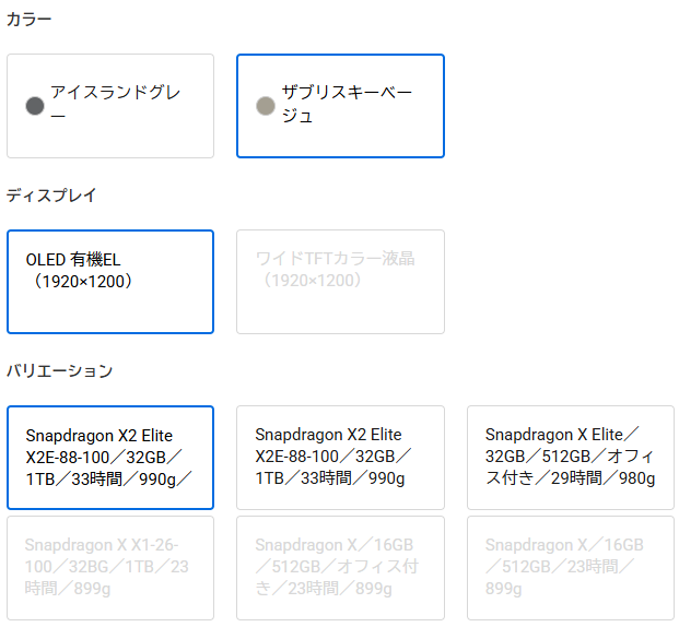 全モデル32GB+1TBに統一されたメモリ・ストレージ構成、最長33時間のバッテリー、80TOPSのNPU性能と、死角の少ない仕上がりになっています。カラーもザブリスキーベージュとアイスランドグレーの2色から選べるので、好みに合わせやすいですね。