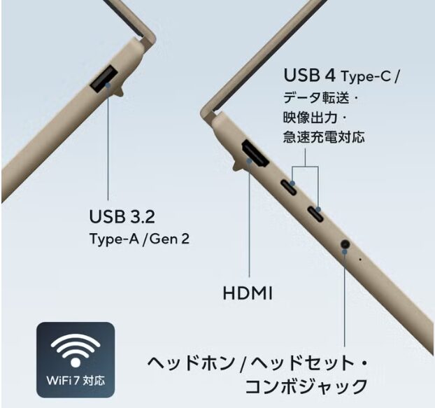 | インターフェース | USB4 Type-C×2、USB 3.2 Type-A×1、HDMI×1、オーディオコンボジャック×1 |