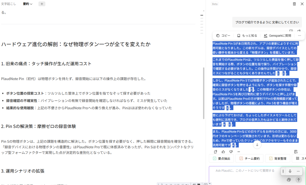 ちなみに感想以降の文章はすべて「Plaud NotePin S」の音声入力から書きました!