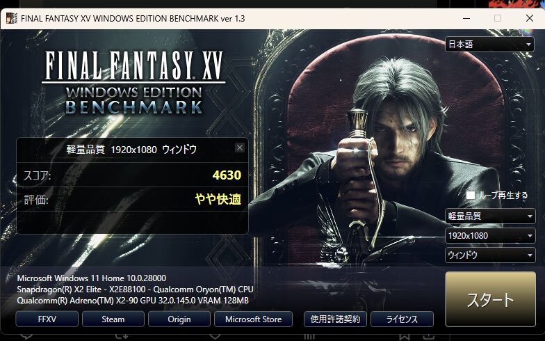 ファイナルファンタジーXVIのベンチマークをコワーキングスペースで試してみたのですが、スコアは4千点台とそれなりに快適です。