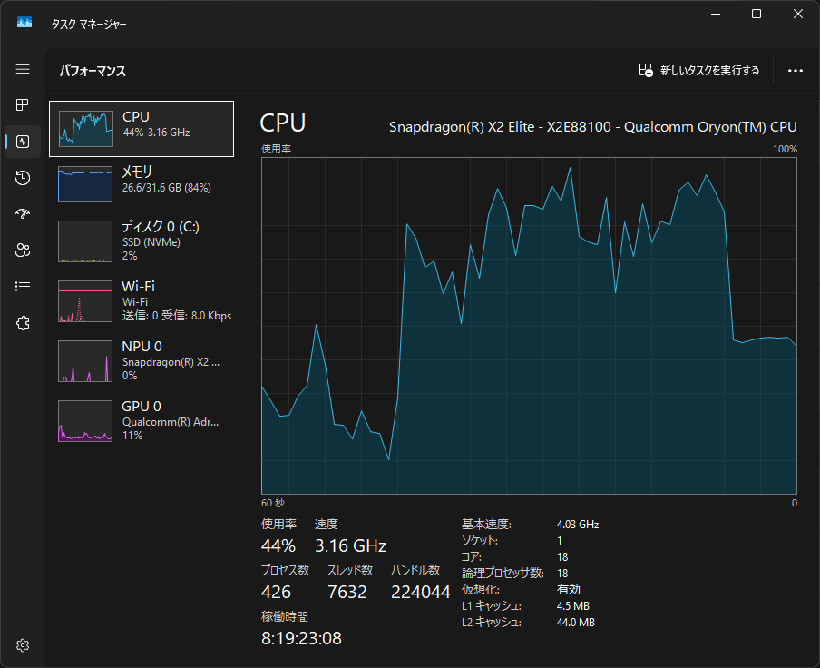 CPUSnapdragon X2 Elite X2E-88-100(18コア、最大4.7GHz)