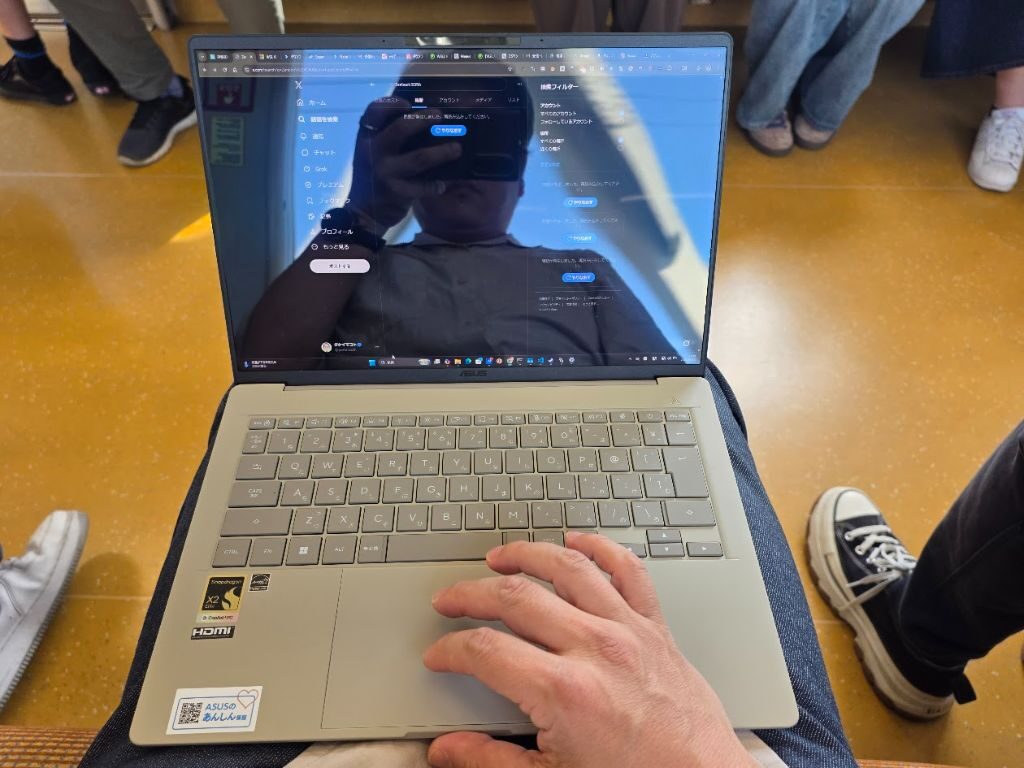 座れたときに膝の上に置いて、Xの投稿チェックや軽いブログ修正をする、という使い方です。