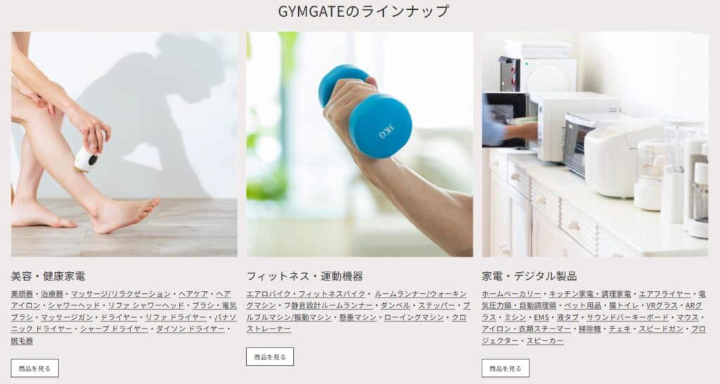 GYMGATEは、美容家電・トレーニングマシン・家電・ガジェットなど幅広いジャンルを扱っているレンタルサービスです。