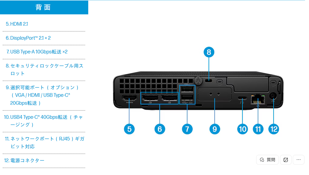 ディスプレイ出力も複数あり、有線LANもあって、USBも前後に分かれているので、業務用としてかなり扱いやすいです。