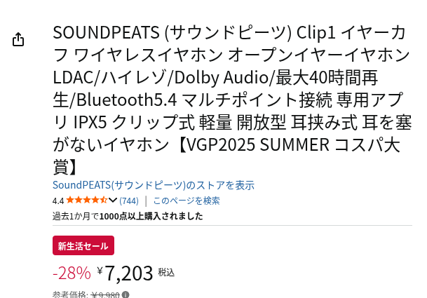SOUNDPEATS Clip1は、2025年8月に発売されたイヤーカフ型の完全ワイヤレスイヤホンです。