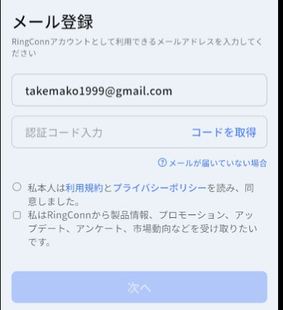 インストールが完了したら、RingConnサービスへの会員登録です。