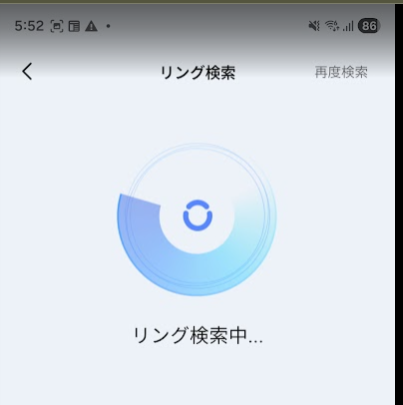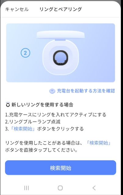 アプリの指示通りにリングをケースにセットして「検索開始」をタップ。