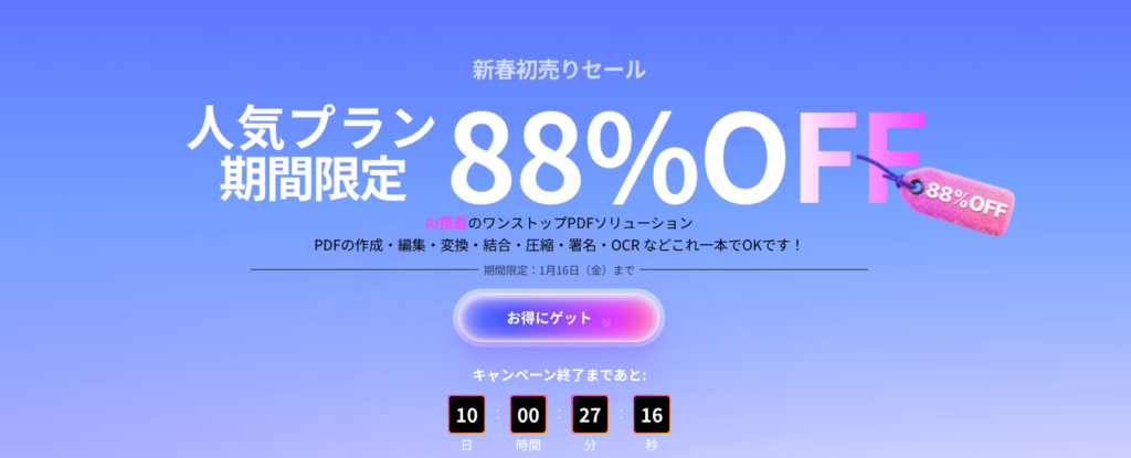 AI機能を搭載し、PDFの作成・編集・変換・OCRなど、あらゆる作業がこれ1本で完結する人気ソフトが最大88%OFFという破格のプライスになっています。