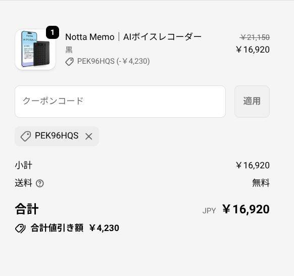 そこに読者限定クーポン「PEK96HQS」を入力すると、さらに20%OFFが適用されて16,920円に。