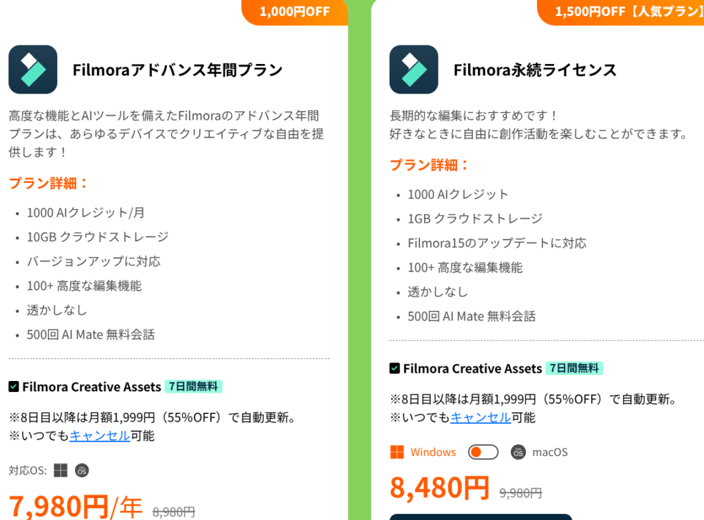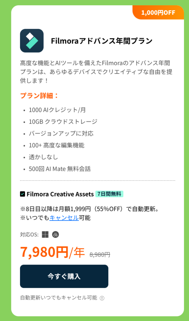 Filmoraアドバンス年間プラン:7,980円/年(通常8,980円、1,000円OFF)