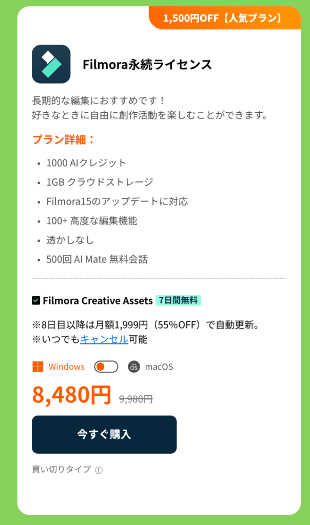 Filmora永続ライセンス:8,480円(通常9,980円、1,500円OFF)