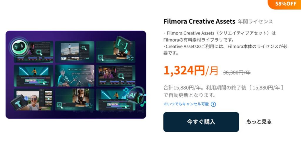 Filmora Creative Assets 年間ライセンス:月額1,324円(通常38,380円/年→15,880円/年、58%OFF)