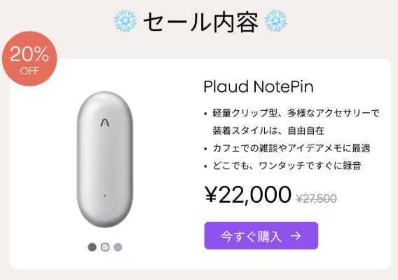 | Plaud NotePin | ¥22,000 | ¥27,500 | 20%OFF |