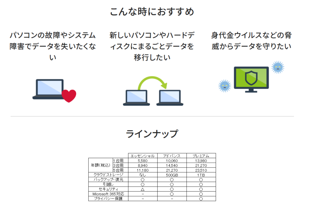 PCやスマホのデータをまるごとバックアップできるのが特徴で、クラウドストレージ付き。ランサムウェア対策のAI保護機能も搭載しています。